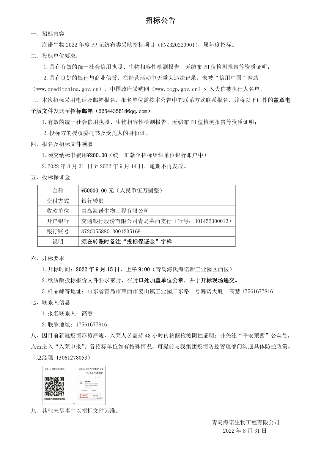 2022年度海諾生物PP無(wú)紡布類(lèi)采購(gòu)招標(biāo)正式開(kāi)始,屆時(shí)我們將秉承公正、公平、公開(kāi)、透明的招標(biāo)原則,期待優(yōu)秀供應(yīng)商的廣泛參與。具體招標(biāo)細(xì)節(jié)如下: