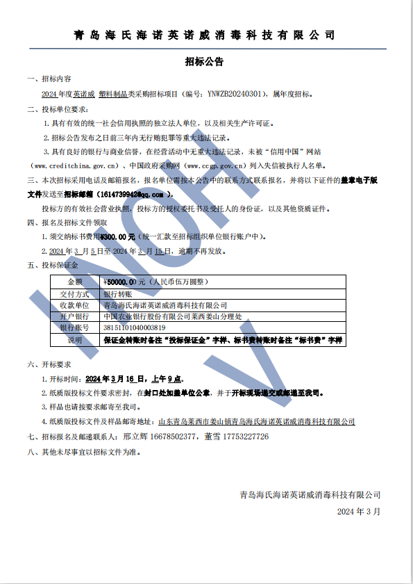 (2024)年度英諾威公司(塑料制品)類采購招標(biāo)公告