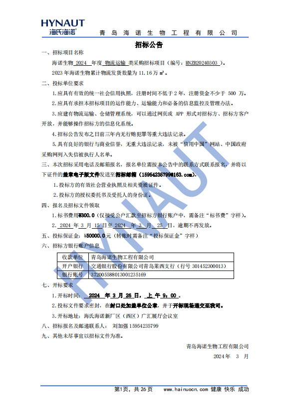 2024年度海諾生物物流運(yùn)輸類采購招標(biāo)公告